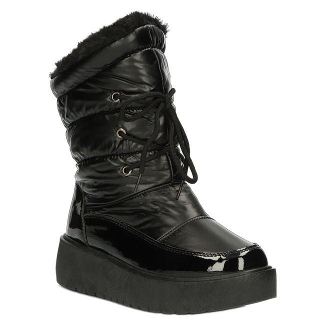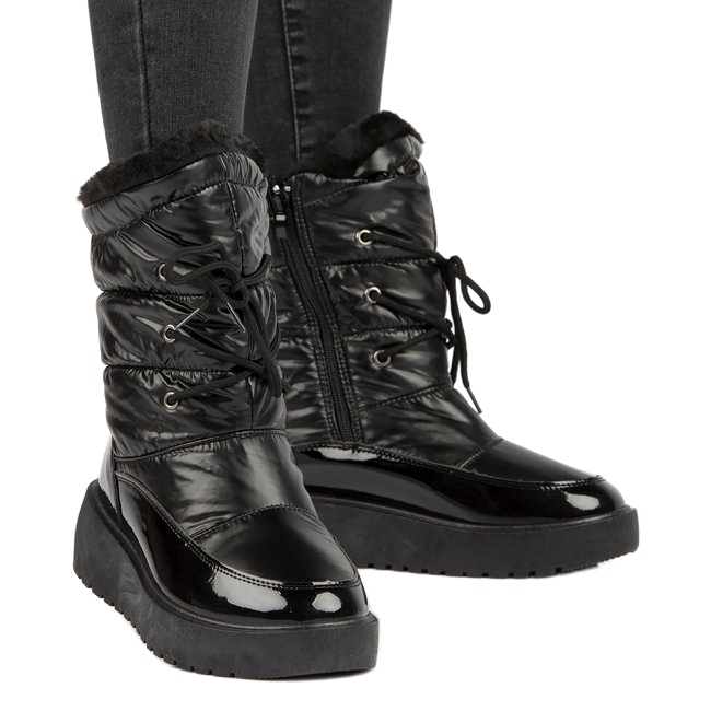 Tocul lor plat, înalt de 4,5 cm și partea superioară sport garantează confort și stabilitate în timpul purtării. Prinse cu fermoar și șireturi, aceste cizme de zăpadă atrag atenția prin stilul lor modern, iar culoarea neagră universală le face să se potrivească cu orice stil de iarnă.