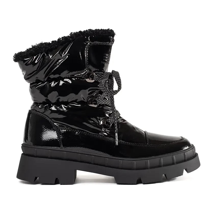 Cizmele negre pentru zapada se caracterizeaza printr-un toc plat de 5 cm si o inaltime a tijei de 14 pana la 15 cm, ceea ce le face sa protejeze perfect picioarele impotriva frigului. Datorită tălpii de plastic călcate, pantofii oferă stabilitate și tracțiune pe diferite suprafețe.