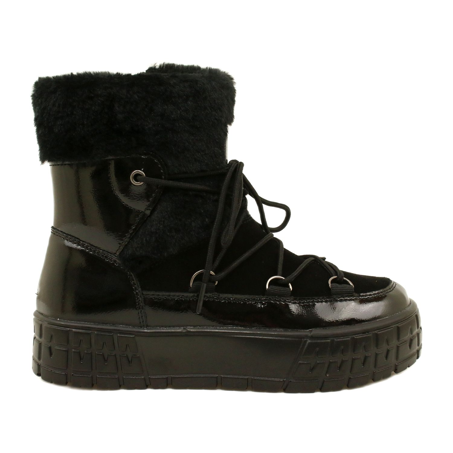 - Combinația de design la modă și funcționalitate - piele lăcuită oferă un aspect elegant, iar blana și banda de rulare asigură practic practicile în condițiile de iarnă.