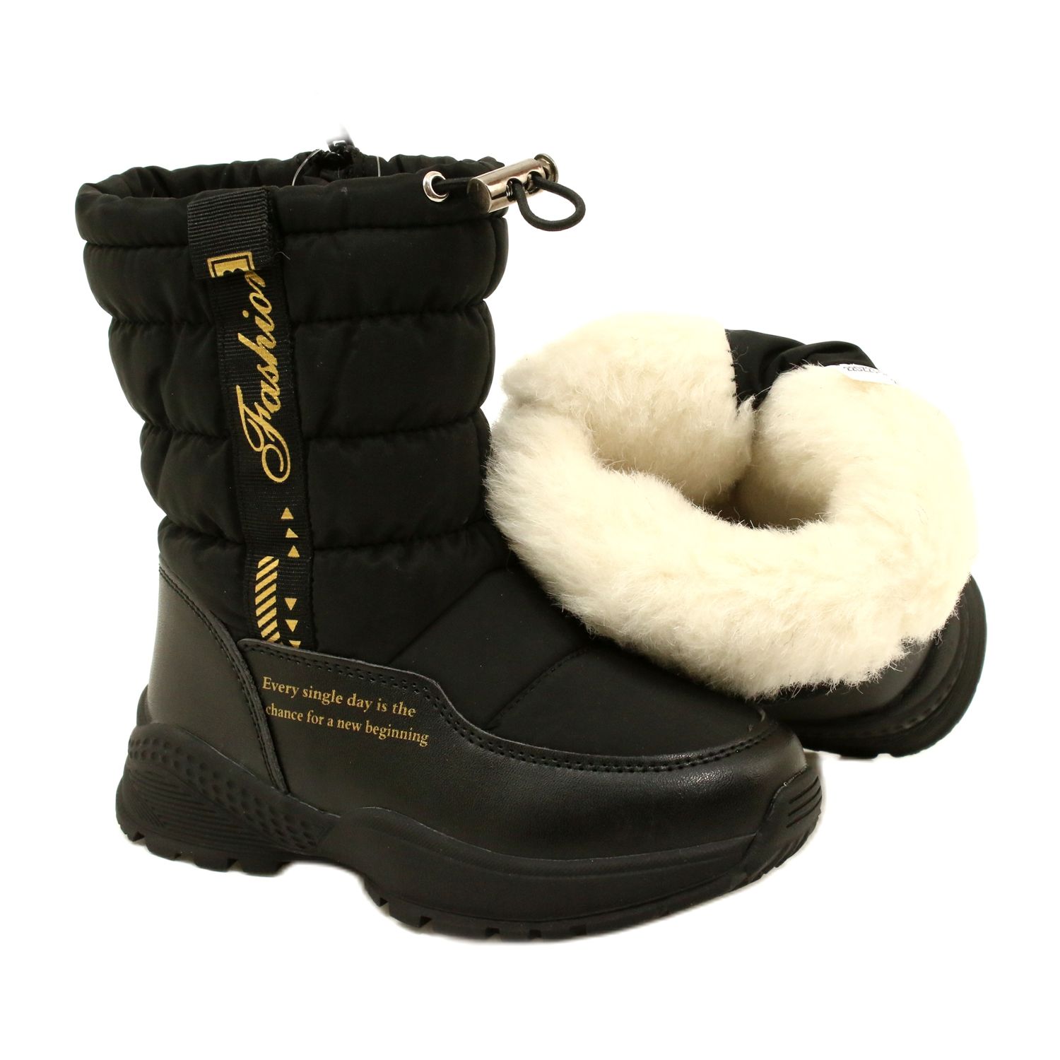 Cizme elegante, negre de zăpadă, Miss Eveto 22DZ23-5274 este o combinație de aspect și funcționalitate la modă. Fabricate dintr -o combinație de piele ecologică și ortalion cu un finisaj lăcuit, cu un model de delicat auriu, oferă protecție împotriva umidității în condițiile de iarnă (impermeabil) și confort termic datorită izolației unei blană moale, groasă, din lână naturală.