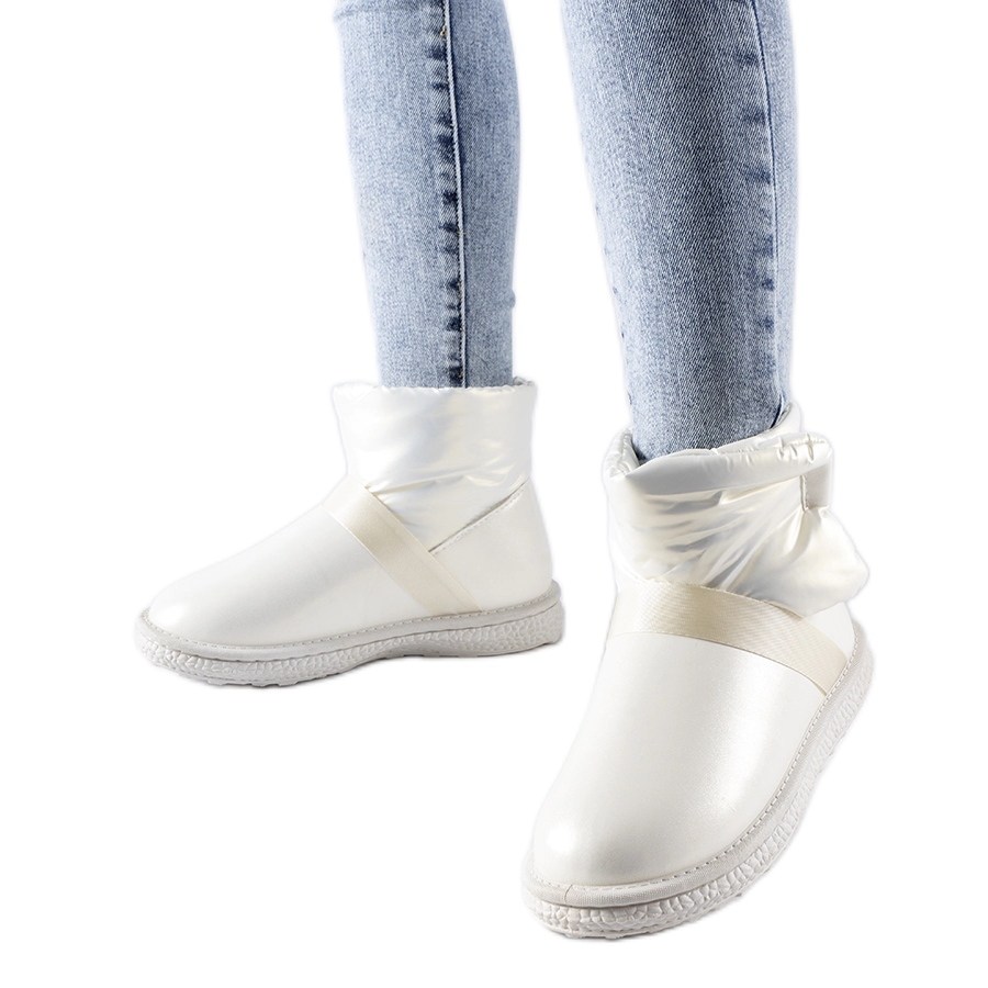 Cizme de zăpadă elegante, scurte, într -o culoare bej universal, cu un luciu delicat, care va fi perfect atât pentru stilizări de iarnă de zi cu zi, cât și pentru cele elegante de iarnă. Datorită platformei (3 cm) și a talpelor cauciucului, obțineți stabilitate și izolare suplimentară de pe suprafețele reci. Încălzirea și materialul exterior din piele ecologică asigură confortul termic, iar elementul de fixare practic de velcro facilitează punerea și potrivirea pantofilor la picior.