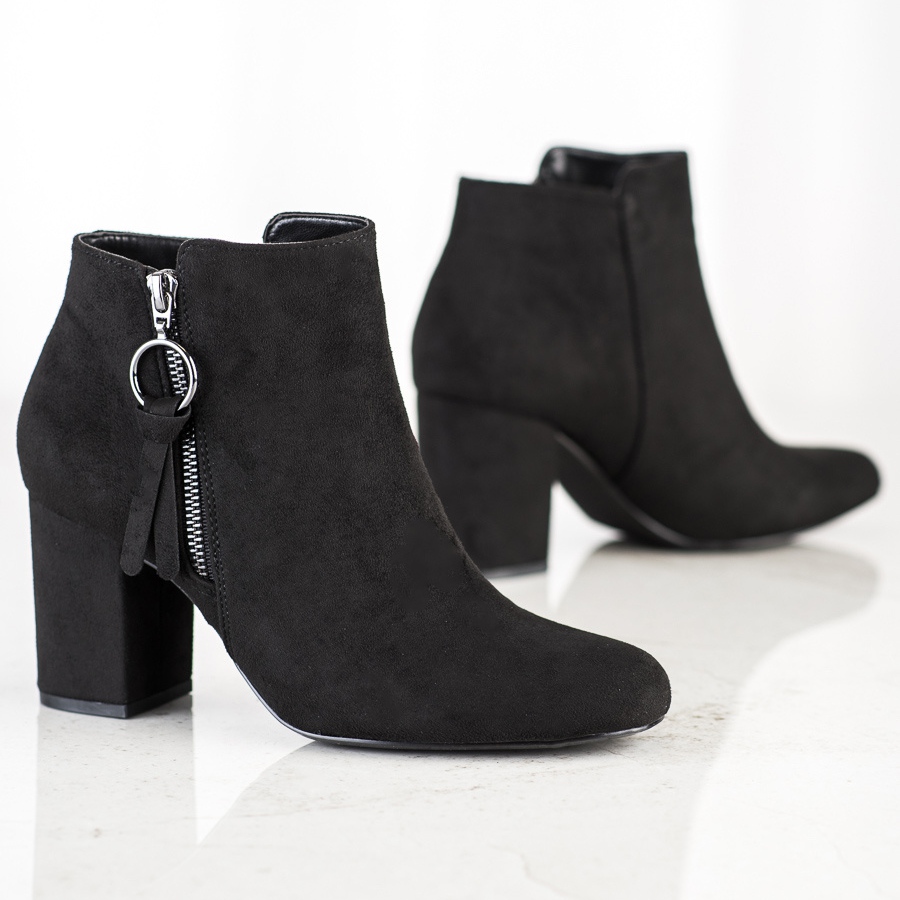 Confectionate din piele intoarsa ecologica de calitate superioara, cizmele se remarca printr-o culoare neagra profunda, care este extrem de universala. Contorul de călcâi este închis și rigidizat, ceea ce asigură un sprijin adecvat gleznei. Înălțimea tocului este de 7,5 cm, ceea ce aduce un plus de clasă și subțiază silueta și, în același timp, garantează confortul la purtare datorită stâlpului stabil.