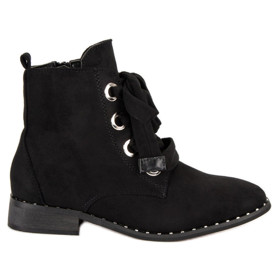 Botinele de piele intoarsa neagra cu siret sunt alegerea perfecta pentru femeile care doresc sa combine eleganta cu confortul. Acești pantofi stilați, concepuți cu atenție la detalii, atrag atenția prin accentele lor feminine, cum ar fi un papion și mici strasuri decorative pe platformă. Realizate din piele intoarsa ecologica de inalta calitate, nu sunt doar la moda, ci si ecologice.