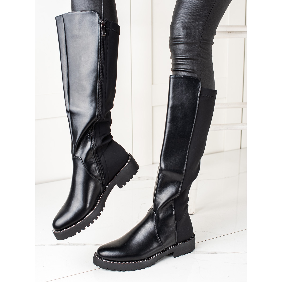 Partea superioară până la genunchi, din piele ecologică de înaltă calitate, garantează nu doar un aspect stilat, ci și o protecție adecvată împotriva frigului din sezonul toamnă/iarnă. Un avantaj suplimentar sunt strasurile subtile care conferă cizmelor strălucire și eleganță excepționale.