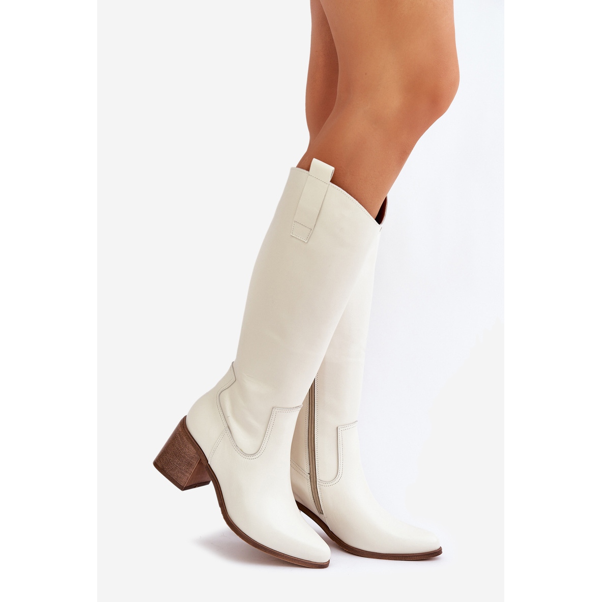 Detalii: Cizme din piele în fața genunchiului pe postarea albă Zazoo 3675