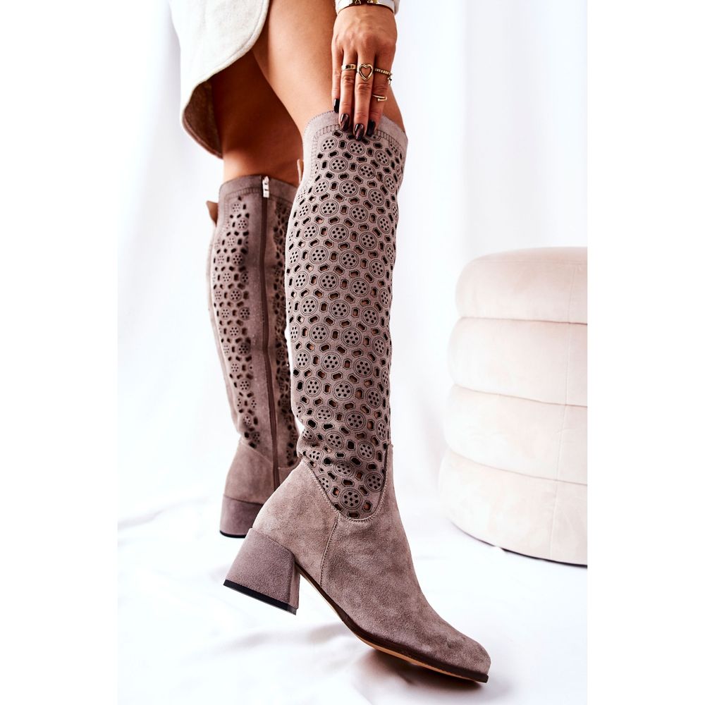 Detalii: PA2 Cizme din piele intoarsa cu model ajurat, maro deschis Hekilea