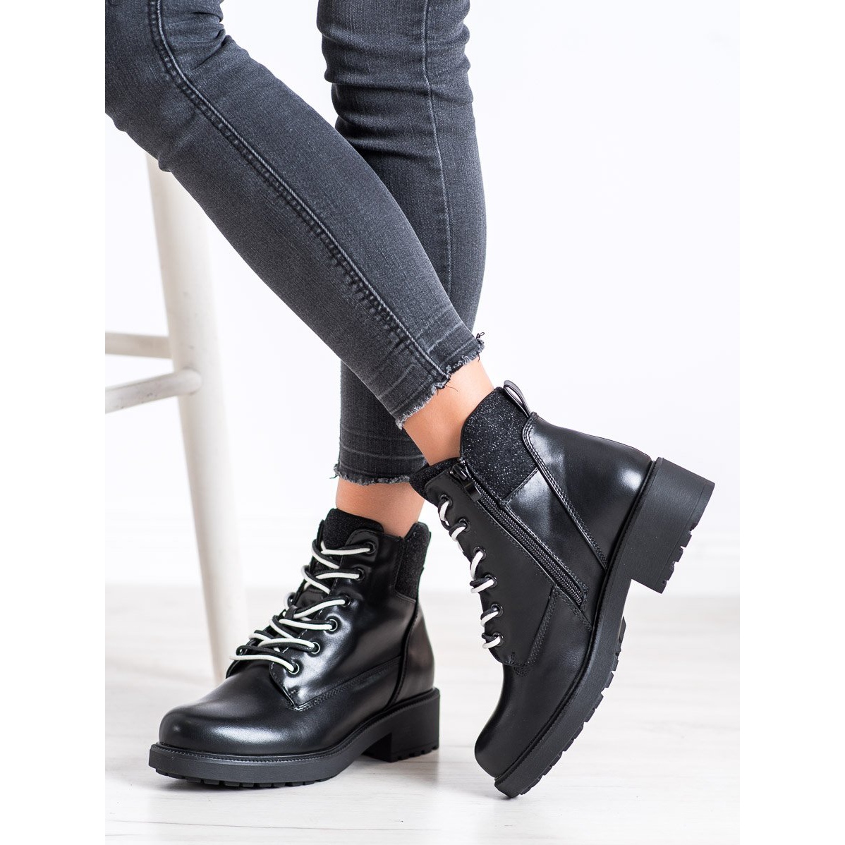 Fabricate din material de înaltă calitate care imita pielea, sunt durabile și ușor de întreținut. Izolația lor asigură confort termic chiar și în zilele mai reci, iar profilul lor perfect înseamnă că poți petrece multe ore în ele fără să te simți obosit. Cizmele au un vârf rotund și o închidere practică cu șireturi și sunt echipate suplimentar cu fermoar, ceea ce le face mai ușor de pus și scos.