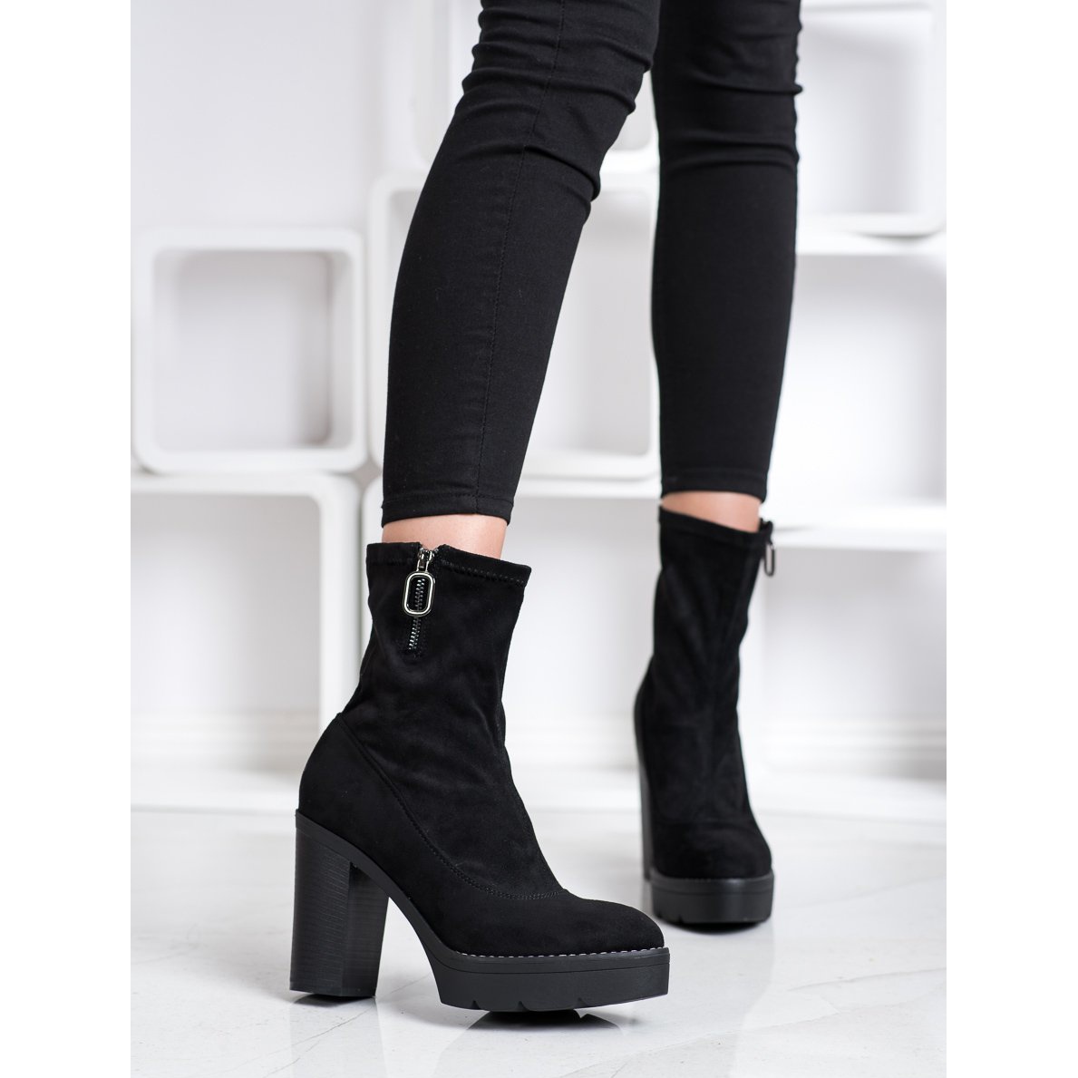 Cizmele Super Mode se caracterizează printr-un vârf rotund și un fermoar practic, ceea ce face ca punerea lor să fie rapidă și convenabilă. Construite pe un stâlp stabil de 11 cm înălțime cu o platformă de 3 cm, oferă un echilibru perfect între eleganță și confort. Lățimea superioară de 26 cm și înălțimea care ajunge deasupra gleznei (16-17 cm) le conferă un caracter unic.