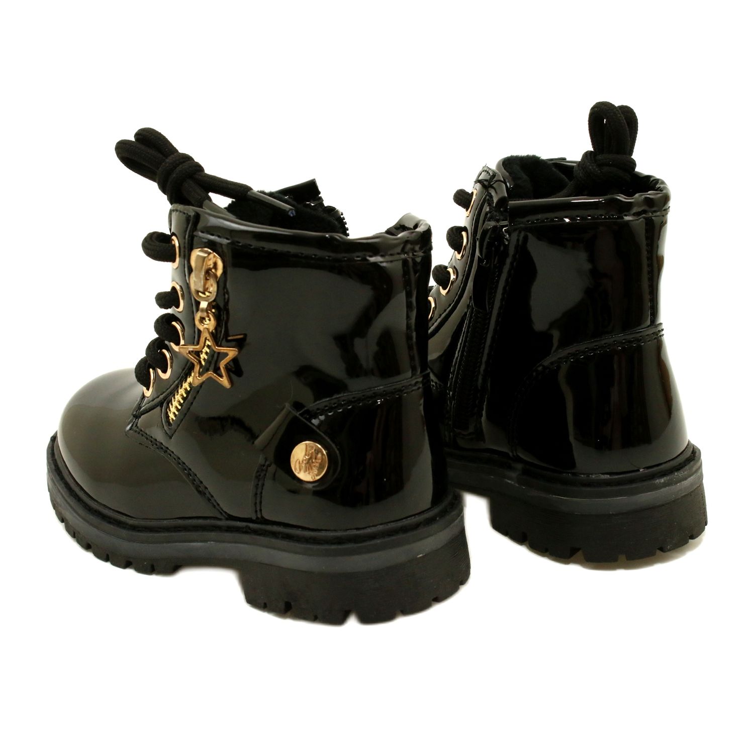 Aceste cizme domnișoare lăcuite combină subtilitatea copiilor cu soluții practice - interiorul cald oferă confort în zilele mai răcoroase, iar fermoarul vă permite să vă puneți rapid și să luați. Materialul negru, lăcuit adaugă stil, în timp ce accentele de aur și vedeta subliniază natura fetei a încălțămintei. O talpă solidă din termocoacuczuk garantează o bună aderență și durabilitate.