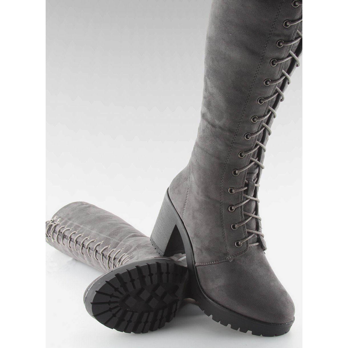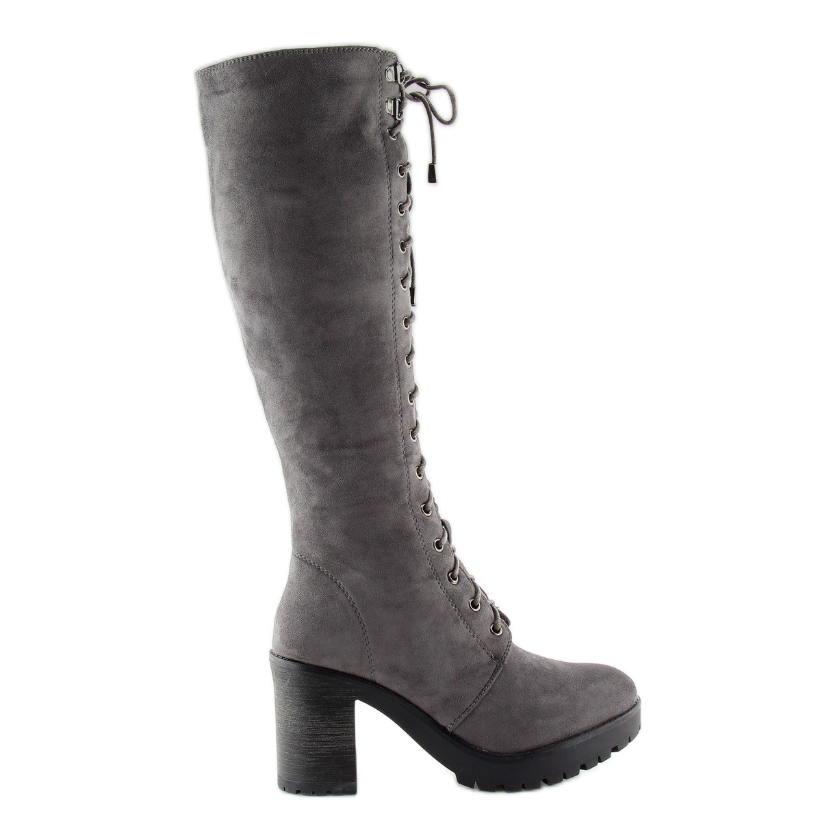Cizmele gri cu șireturi cu toc larg sunt o alegere perfectă pentru fiecare femeie la modă căreia îi pasă de încălțăminte elegantă și confortabilă. Realizate din piele intoarsa ecologica, aceste cizme imbina eleganta si functionalitatea. Interiorul lor este căptușit cu catifea moale și călduroasă, care asigură căldură și confort chiar și în zilele mai reci.