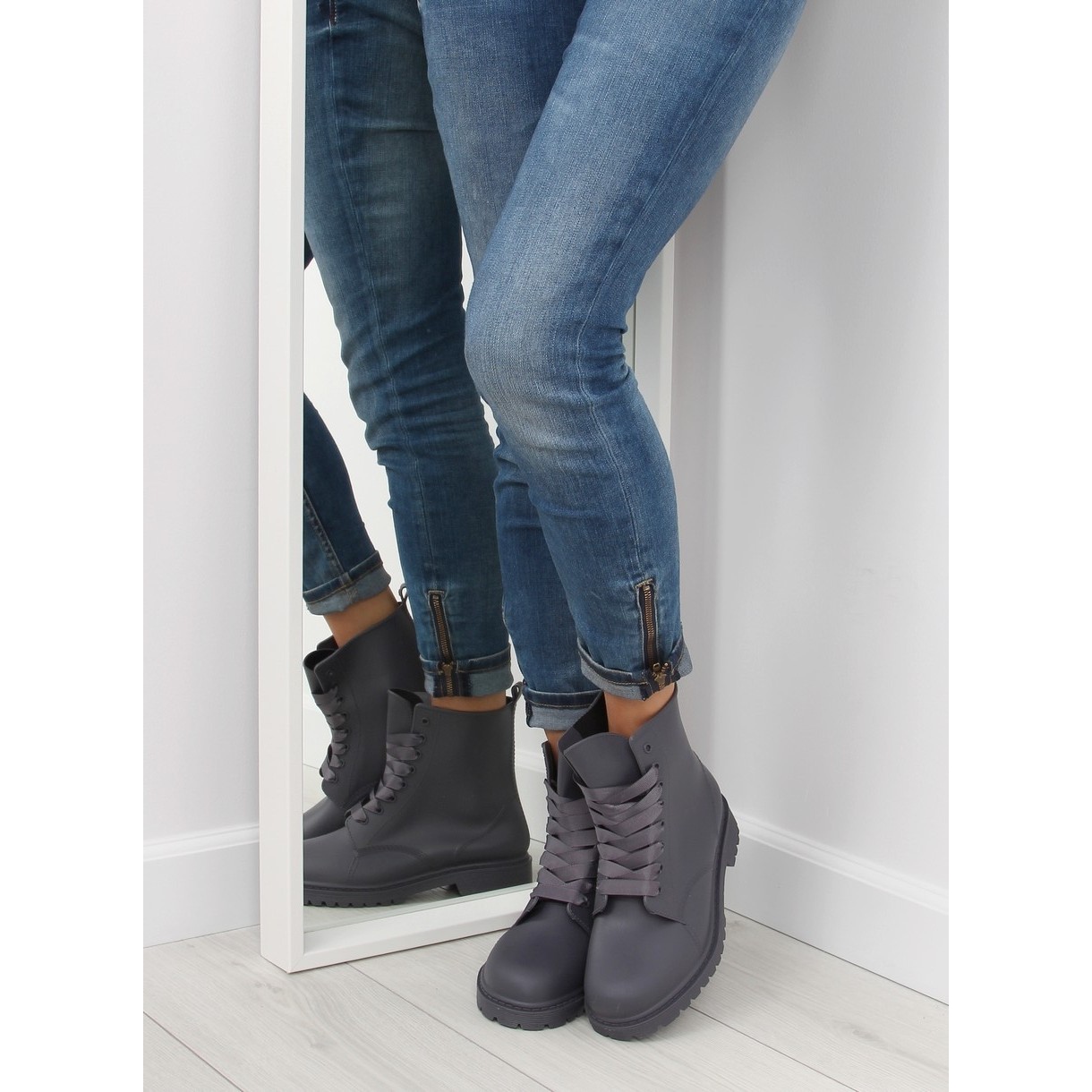 Descoperă cizme cu șireturi în culoarea gri la modă D56P gri - combinația perfectă de stil și funcționalitate! Aceste cizme Wellington unice de damă combină un design militar distinctiv cu caracterul practic, ceea ce le face o soluție perfectă pentru zilele ploioase.