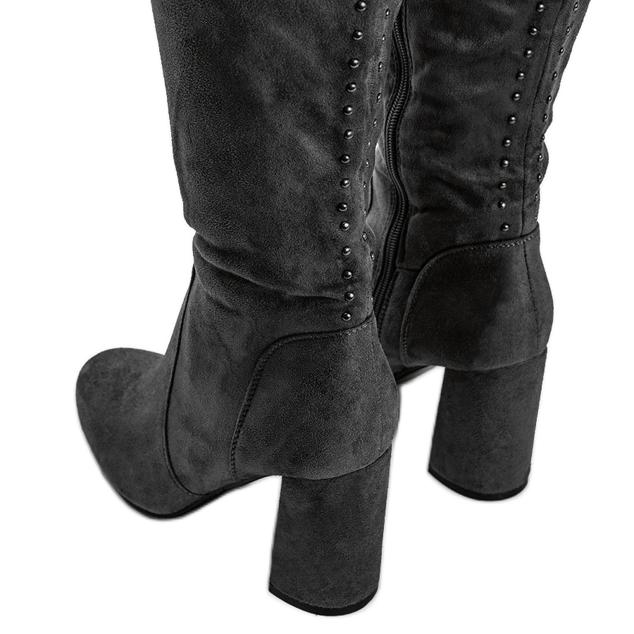 Detaliile atrăgătoare, cum ar fi fermoarul din partea superioară și vârful rotund, adaugă subtilitate și stil pantofilor. Talpa sintetică și tocul bloc de 9 cm nu numai că oferă stabilitate, ci și lungesc picioarele, subliniind silueta. Datorita culorii lor gri universale, aceste cizme pot fi usor combinate cu o varietate de tinute, de la cele de zi cu zi la cele mai elegante.