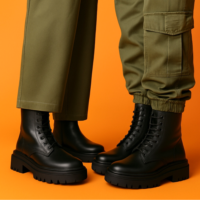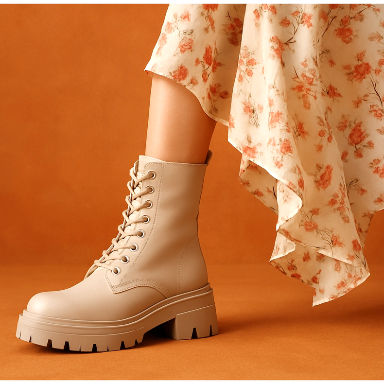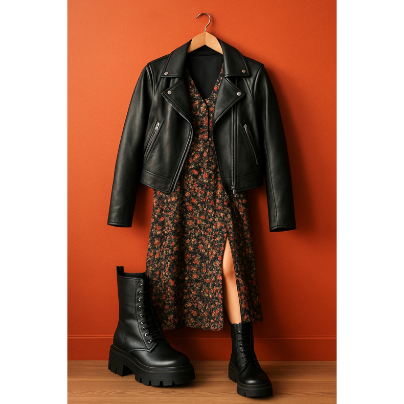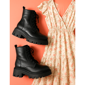 Combinația de cizme de muncitori grele cu o rochie florală delicată este un clasic care funcționează mereu. Alege o rochie midi sau maxi cu o fanta care va scoate la iveala partea superioara a pantofului. Adaugă o jachetă de motociclist din piele sau o jachetă supradimensionată. Acest set este echilibrul perfect între stilul rock și fetița romantică. Amintiți-vă să nu exagerați cu accesoriile - pantofii sunt un accent suficient de puternic aici.