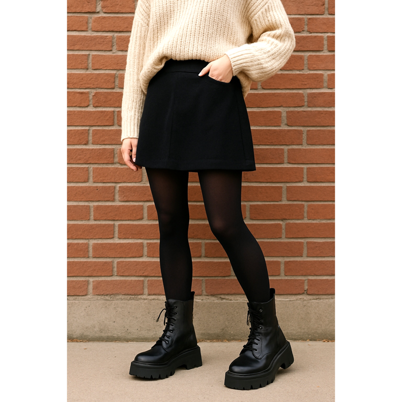 Cizmele groase arată grozav și cu fuste mini scurte. Pentru a evita un efect vulgar, alege colanti grosi, negri (opaci) si un top mai lejer, de ex. un pulover din tricot gros ascuns parțial în spatele centurii. Talpa groasă subțiază vizual picioarele, iar partea superioară înaltă adaugă caracter. Acesta este stilul perfect pentru plimbările de toamnă sau întâlnirile cu prietenii.