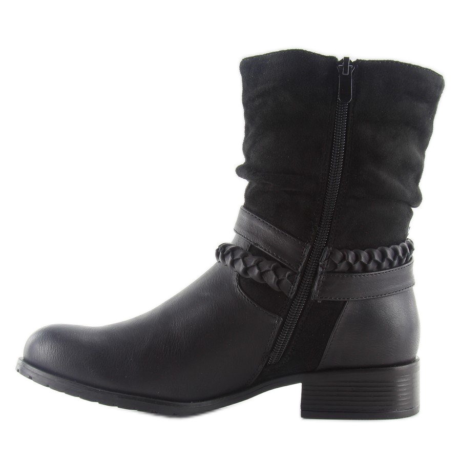 Cizmele în stil militar 632-pa negre sunt o alegere perfectă pentru femeile care doresc să îmbine confortul cu un aspect la modă. Se caracterizează printr-o parte superioară simplă, decorată cu curele elegante cu cataramă, care le conferă un aspect unic, caracteristic. Realizate dintr-o combinatie de piele ecologica integrala si piele intoarsa, aceste cizme nu sunt doar estetice, ci si functionale.