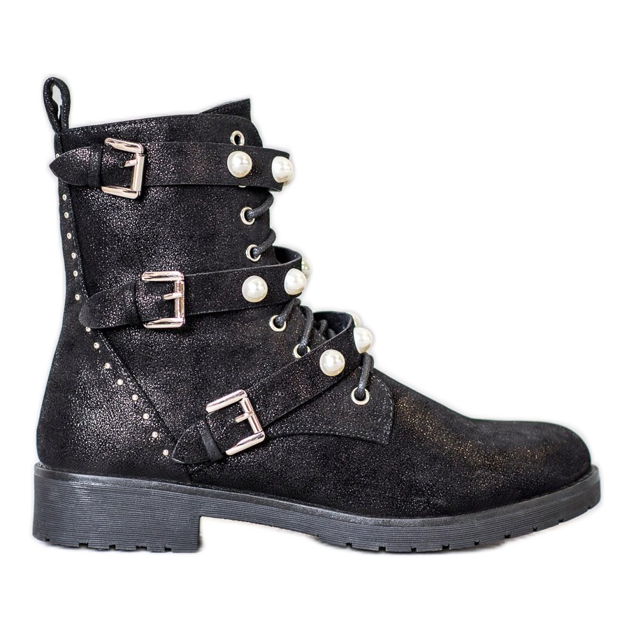 Aceste cizme elegante au șireturi în față și un fermoar practic în lateral, ceea ce le face ușor de pus și scos. În plus, aspectul lor original este subliniat de curele cu catarame decorate cu perle și mici strasuri strălucitoare, care le conferă un caracter rock.