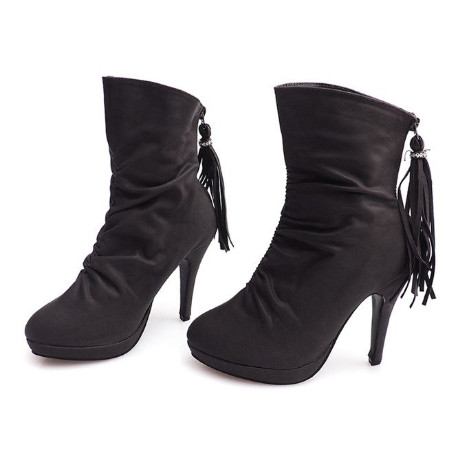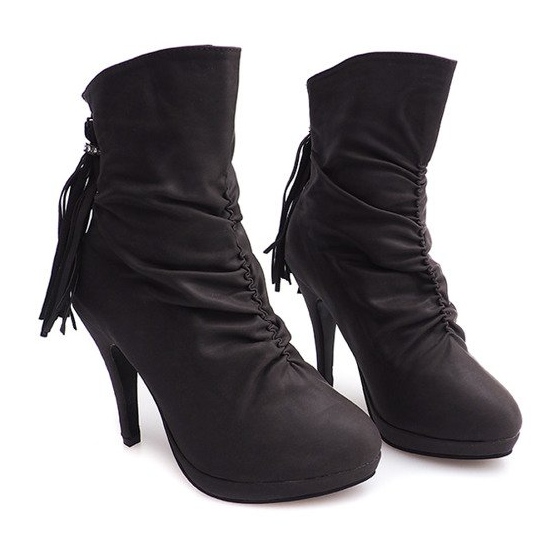 Un toc stiletto inalt cu inaltimea de 11 cm adauga un plus de eleganta, iar varful rotunjit le face extrem de confortabile. Un avantaj in plus il reprezinta ciucuri lung agatat la spate, care confera pantofilor un caracter original. Cizmele sunt prinse cu fermoar pe lateral, ceea ce le face ușor de pus și scos. Datorită talpii sintetice și branțului din material, încălțămintea oferă o amortizare și durabilitate adecvate.