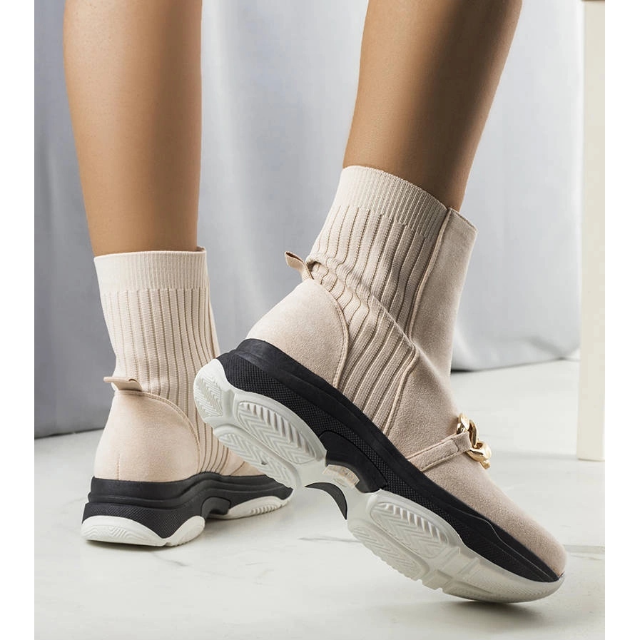 Cizmele elegante, confortabile și calde, într-o culoare bej, este o propunere care va adăuga stil la fiecare stilizare de toamnă și de iarnă. Partea superioară din piele ecologică din piele de căprioară de înaltă calitate, cu inserții elastice, asigură potrivirea și confortul purtării, iar lanțul decorativ oferă pantofilor un personaj urban la modă. Interiorul finisat cu material moale care imită blana încălzește eficient piciorul, datorită căreia modelul va funcționa la temperaturi mai scăzute.