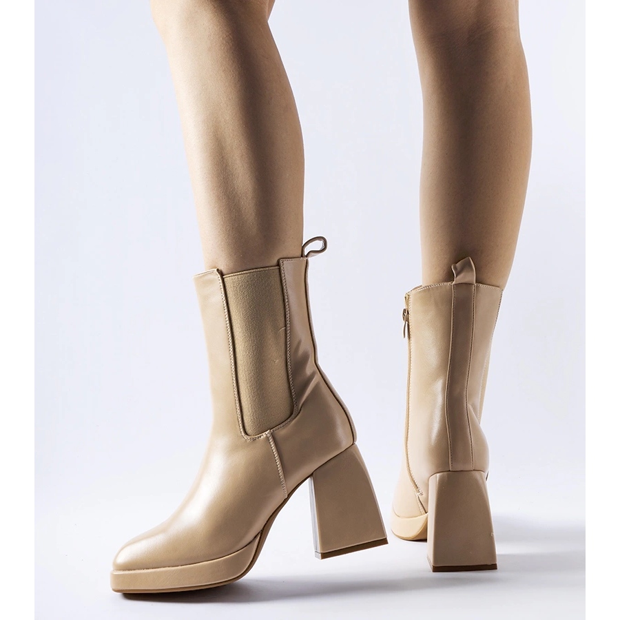 Botinele izolate bej cu toc masiv sunt un produs pentru femei, perfecte pentru zilele de toamna si iarna.