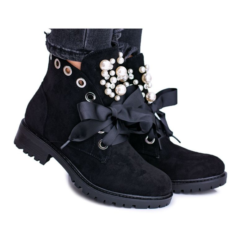 Detalii: Cizme Izolate Din piele intoarsa Cu Perle si Panglica, Perla Neagra negru