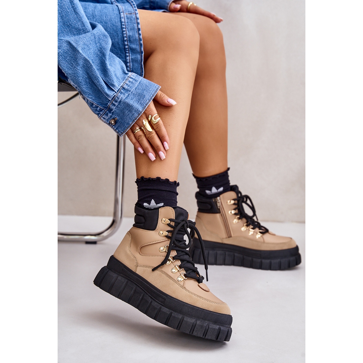 Modelul montat pe o platformă masivă de 5 cm înălțime te izolează eficient de pământul rece, asigurând confort în timpul plimbărilor lungi. Fermoarul și șireturile suplimentare permit o potrivire perfectă pe picior, ceea ce le face nu numai funcționale, ci și la modă.