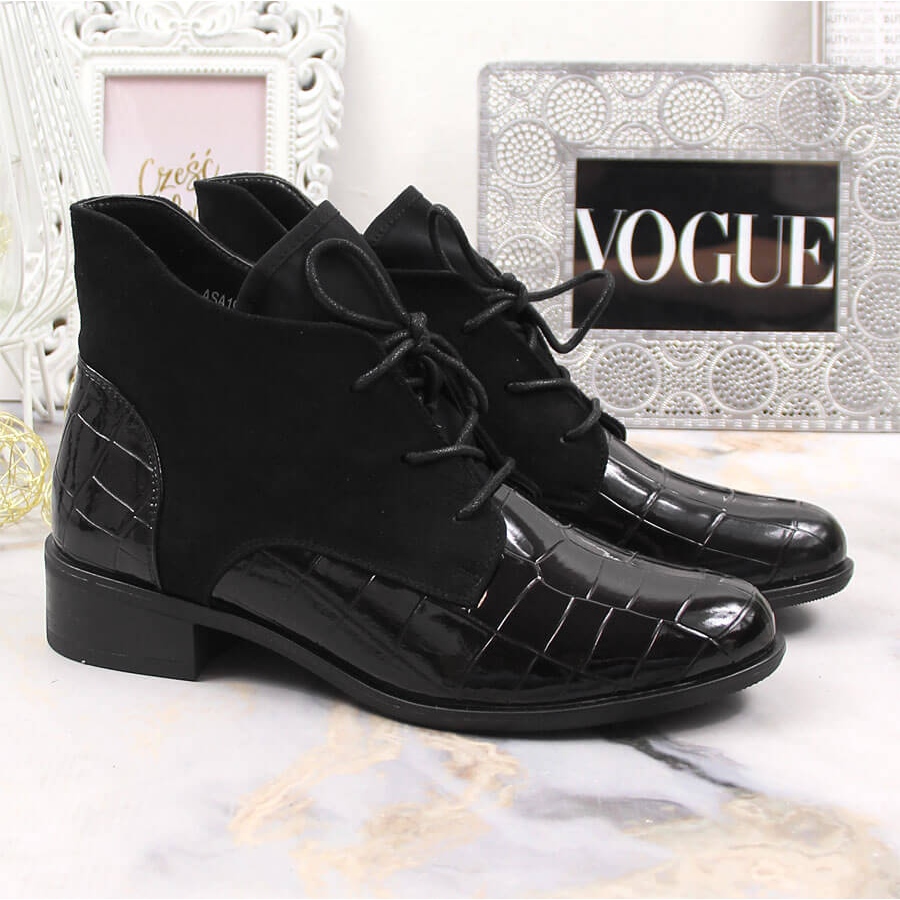Botinele cu șireturi izolate negre Jezzi sunt alegerea perfectă pentru zilele de toamnă și iarnă. Acești pantofi stilați combină funcționalitatea cu un aspect la modă, devenind un element indispensabil al oricărei garderobe. Realizate din piele ecologica de inalta calitate, acestea se caracterizeaza printr-un finisaj elegant, lacuit, care le confera un caracter unic.