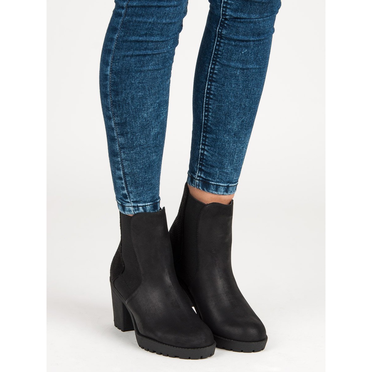Botinele Chelsea negre au un toc de 8 centimetri sub forma unui stalp, care nu numai ca alungeste optic picioarele, dar asigura si stabilitate la purtare. Modelarea perfectă a branțului și pătura moale pentru încălțăminte înseamnă că nici măcar orele lungi petrecute în picioare nu vor fi simțite.