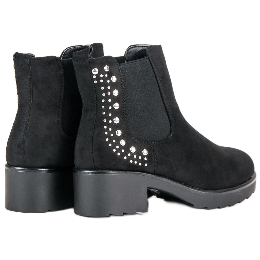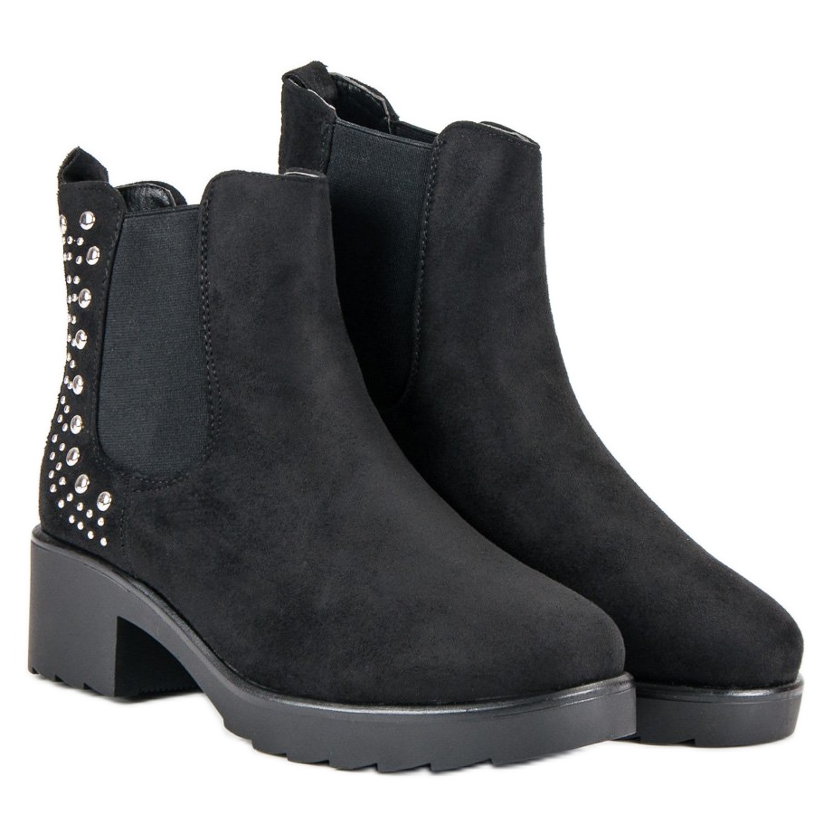Culoarea elegantă neagră face ca aceste cizme să se potrivească perfect în multe stiluri - atât casual, cât și mai formale. Strasurile si crampoanele stralucitoare le dau un caracter feminin, iar tocul inalt de 5 cm iti permite sa te bucuri de o silueta delicata fara a sacrifica confortul.