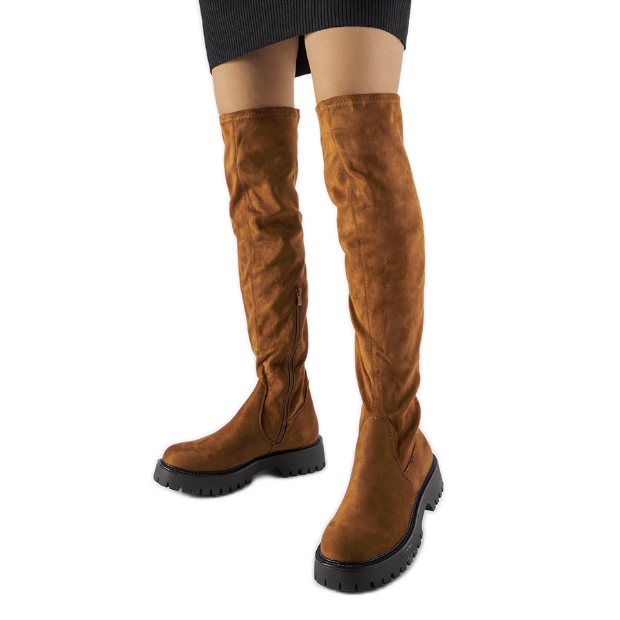Cizmele lungi maro ale lui Kossuth sunt o combinație de design modern și funcționalitate practică. Fabricat din piele ecologică într -un finisaj din piele de căprioară în nuanța de cămilă, atrage atenția cu o tăietură clasică, cu un vârf rotund și o talpă masivă, de cauciuc negru, care garantează strânsoarea chiar și pe o suprafață umedă. Cizmele ajung peste genunchi (înălțime de 60 cm) și au un călcâi plat, de 4 cm, care asigură confortul în timpul unei uzuri lungi.