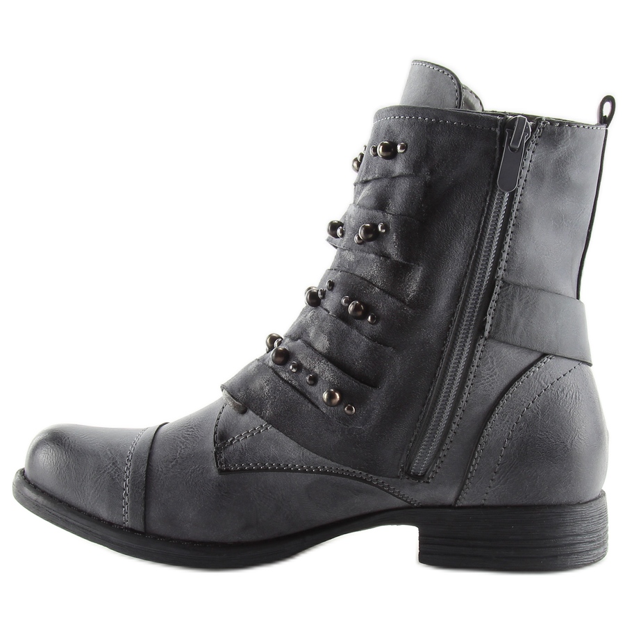 Va prezentam cizme militare de dama in culoarea gri, care imbina stilul, confortul si originalitatea. Realizate din piele ecologica de inalta calitate, acestea ofera nu doar un aspect atractiv, ci si durabilitate. Partea superioară caracteristică a acestora, cu o tablă atrăgătoare, decorată cu strasuri, atrage atenția, adăugând un caracter unic fiecărui stil.