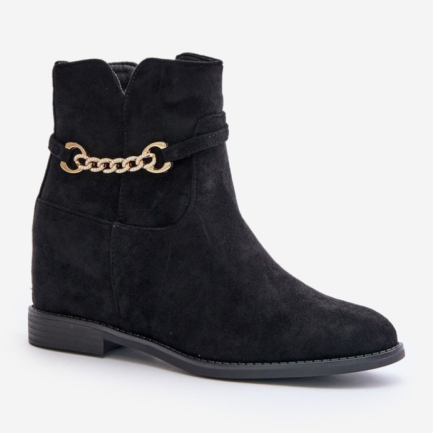 Botine de dama din piele intoarsa ecologica. Așezat pe un toc plat și o pană ascunsă. Degetele rotunjite. Prins cu fermoar. Un avantaj suplimentar al acestui model este o curea subțire cu un lanț scurt de aur.