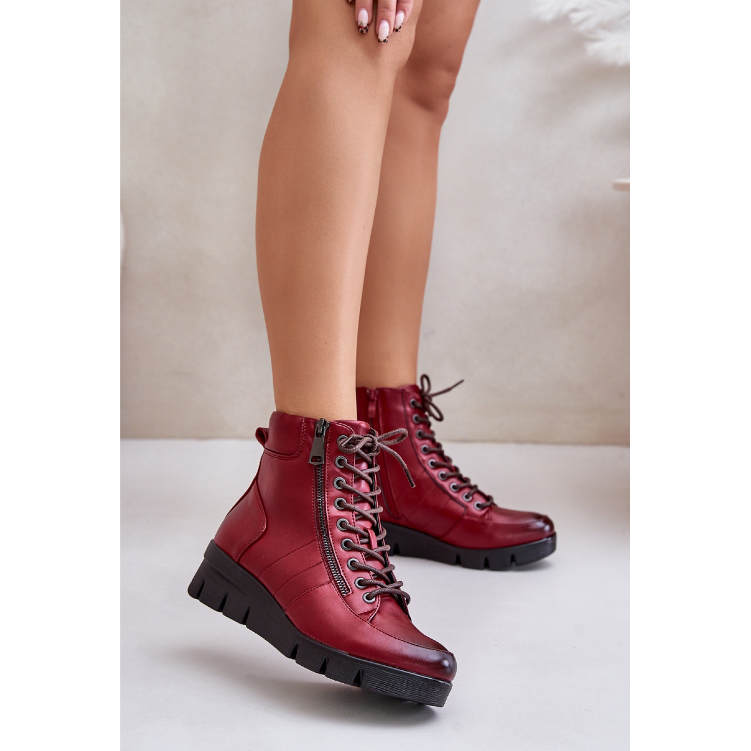 Botine de dama din piele ecologica. Așezat pe o platformă și pană. Incheiat cu fermoar si siret, ceea ce asigura o potrivire perfecta pe picior. Degetele rotunjite. Interiorul este izolat cu o pătură de pantofi plăcută la atingere. Un model extrem de usor care va completa perfect stilurile de toamna si iarna!