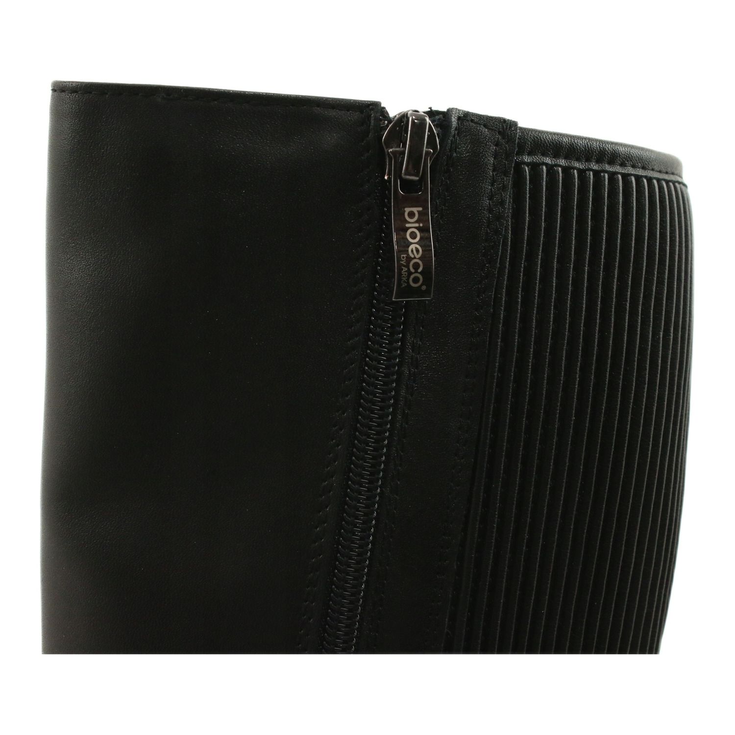 Caracteristica care distinge aceste cizme este o inserție flexibilă, largă din piele, care se adaptează la lățimea piciorului, garantând o potrivire perfectă. Înălțimea superioară de aproximativ 40 cm înseamnă că ghetele acoperă eficient gambele, iar tocul mic de 3,2 cm asigură confortul purtării pe tot parcursul zilei.
