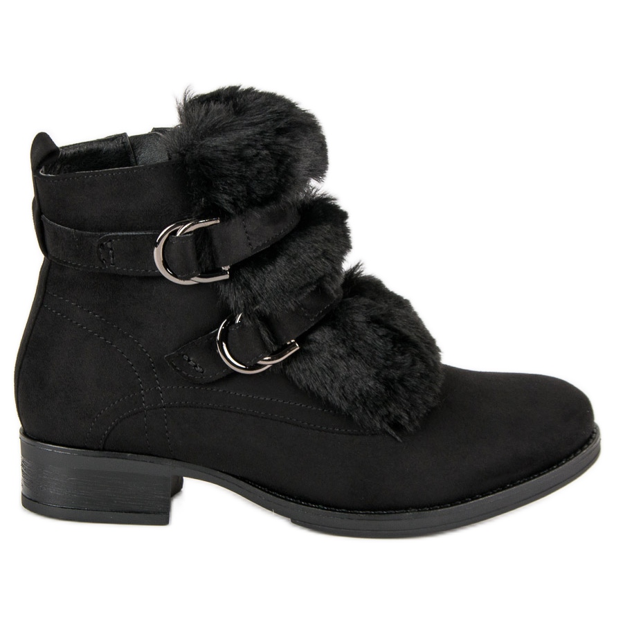 Cizmele negre cu blană au vârful rotund și se prind cu fermoar, ceea ce le face ușor de pus și scos. Curelele decorative cu catarame argintii subliniază în plus stilul lor unic. Tocul ușor de 3,5 cm face pantofii confortabil de purtat toată ziua, indiferent de ocazie.