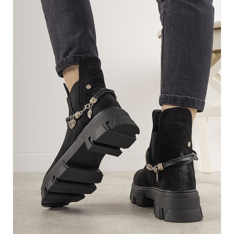 Cizmele negre cu o brățară Fearless sunt o alegere perfectă pentru sezonul viitor toamnă-iarnă. Acești pantofi stilați, din piele de piele ecologică de înaltă calitate, îmbină eleganța și caracterul unic. Efectul lor uzat asupra degetului de la picior adaugă originalitate, iar talpa înaltă, cu model, le face să atragă privirea.