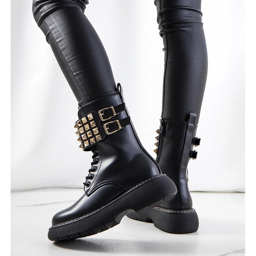Vă prezentăm cizme negre cu știfturi Lacer de la marca PA1, care cu siguranță vor adăuga caracter oricărui stil! Acești încălțăminte la modă combină un design excelent cu o manoperă de înaltă calitate. Partea superioară decorată cu știfturi aurii face ca cizmele să arate uimitor și atrăgătoare. Talpa înaltă evidențiază subtil picioarele, iar tocul plat asigură confortul la purtare pe tot parcursul zilei.