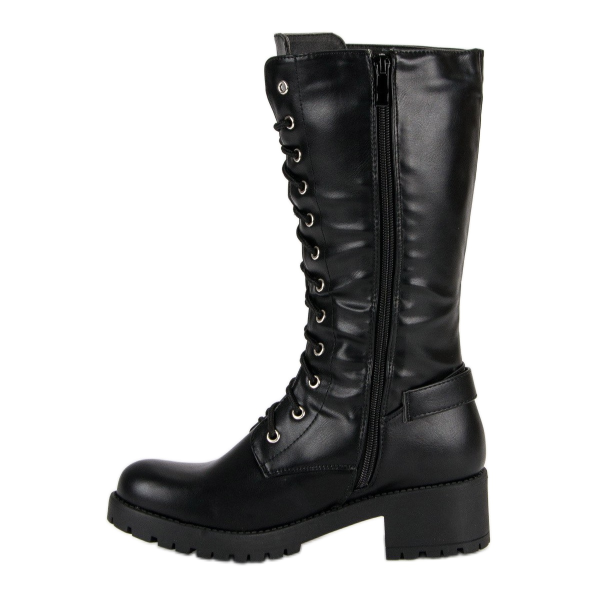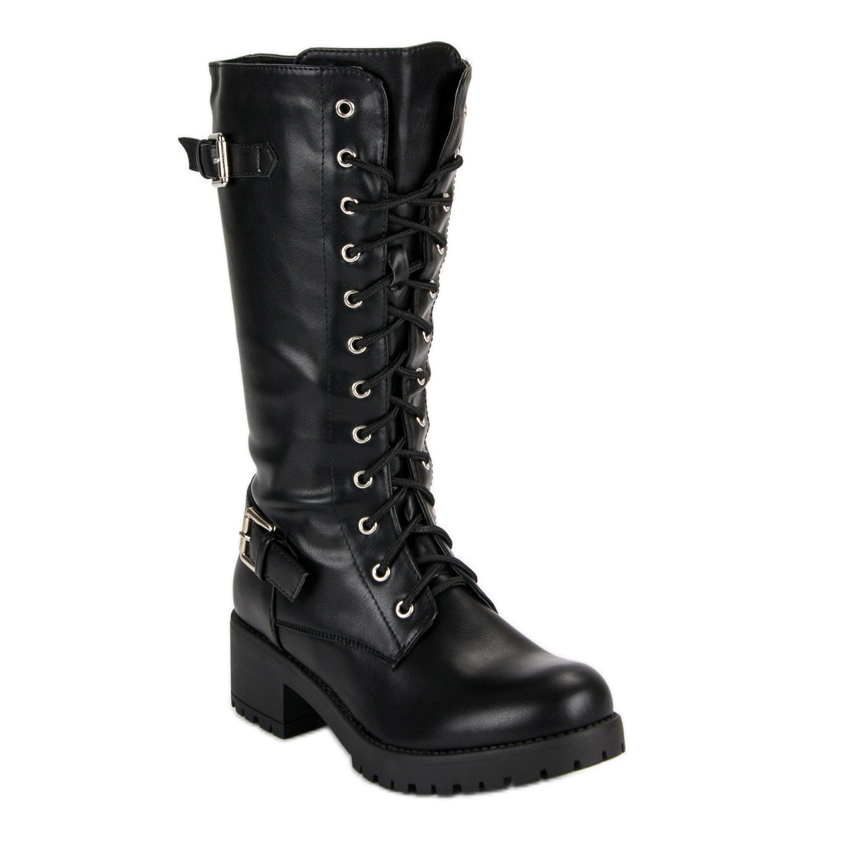 Cizmele negre au fermoar practic și închidere cu șireturi, ceea ce permite o potrivire perfectă la orice vițel. Curelele decorative suplimentare cu catarame argintii le conferă un aspect distinctiv, îndrăzneț, perfect pentru femeile care ar dori să adauge un pic de fler stilurilor lor.
