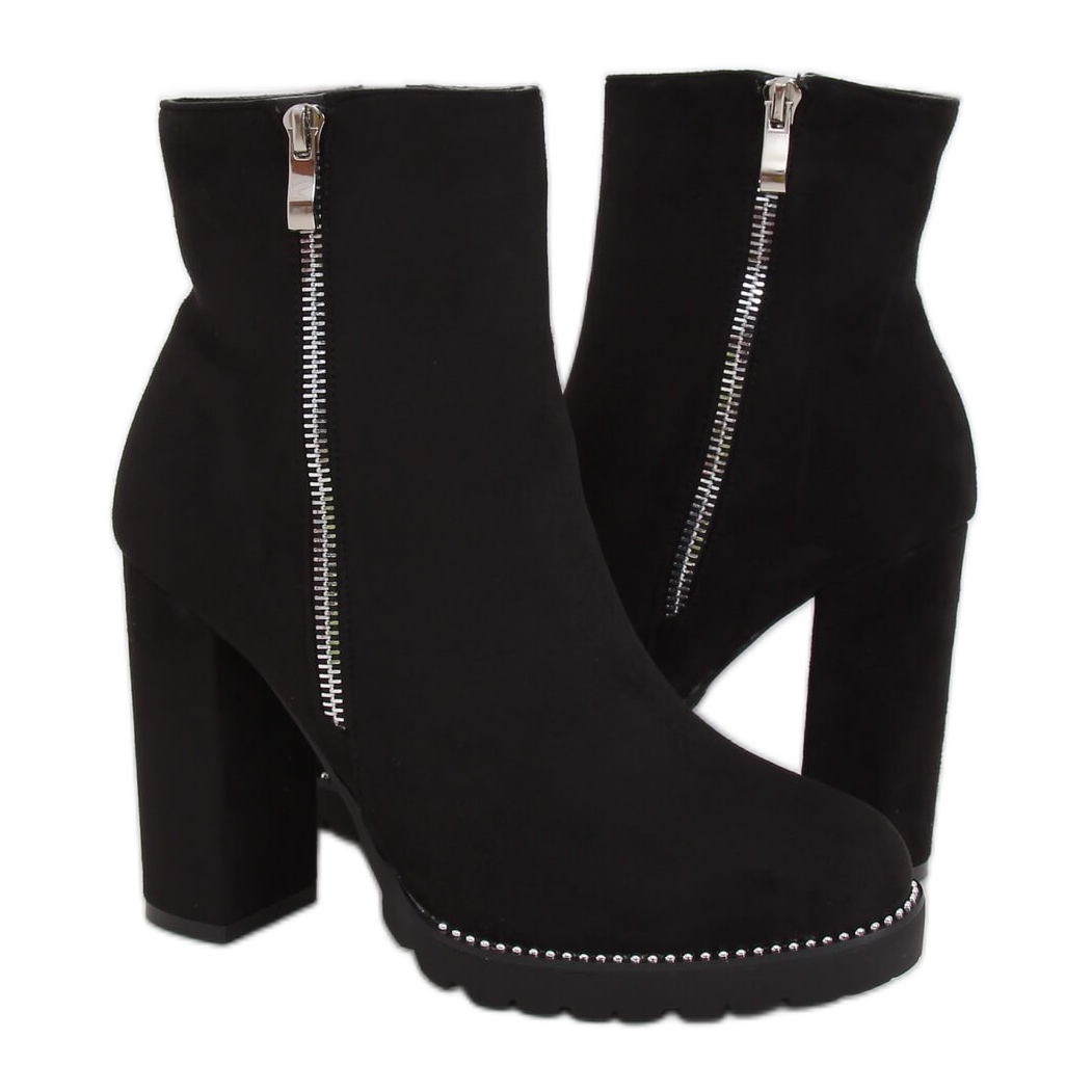 Descoperiți eleganța și confortul cu botinele negre BM287 Black cu toc! Aceste botine de dama din piele intoarsa ecologica sunt alegerea perfecta pentru fiecare femeie care vrea sa combine moda cu confortul. Designul lor frumos, îmbogățit cu accesorii elegante, precum margele argintii și fermoar decorativ, le conferă un caracter unic care îi face să iasă în evidență din mulțime.