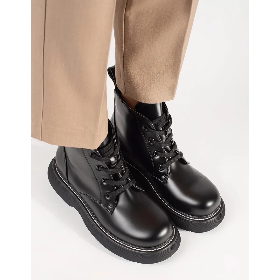 Aceste cizme au un călcâie construit și o înălțime a superiorului de 12 cm, ceea ce accentuează perfect picioarele și le oferă zvelt. Talpa de plastic este netedă, ceea ce crește adeziunea, iar platforma înaltă de 3 cm adaugă eleganță și prelungește optic figura. Datorită dantelării, pantofii pot fi ușor adaptați nevoilor individuale, iar culoarea lor universală și neagră îi face să se potrivească cu multe stiluri - atât casual, cât și mai elegant.