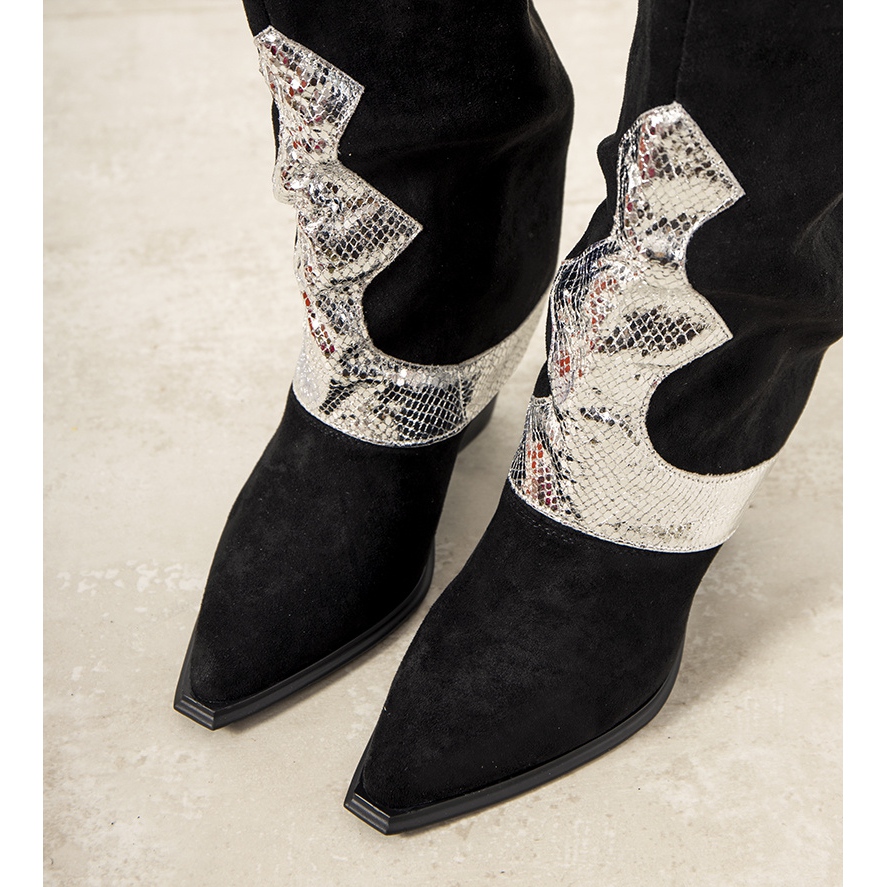 Cizmele cowboy slip-on Luciana sunt o alegere perfectă pentru femeile care doresc să îmbine confortul cu stilul la modă. Acesti pantofi eleganti, confectionati din piele intoarsa ecologica de inalta calitate, incanta prin grija si atentia la detalii. Partea superioară care ajunge până la mijlocul gambei, combinată cu un toc plat delicat de 9 cm înălțime, le adaugă caracter și le face o completare perfectă pentru stilul de toamnă și iarnă.