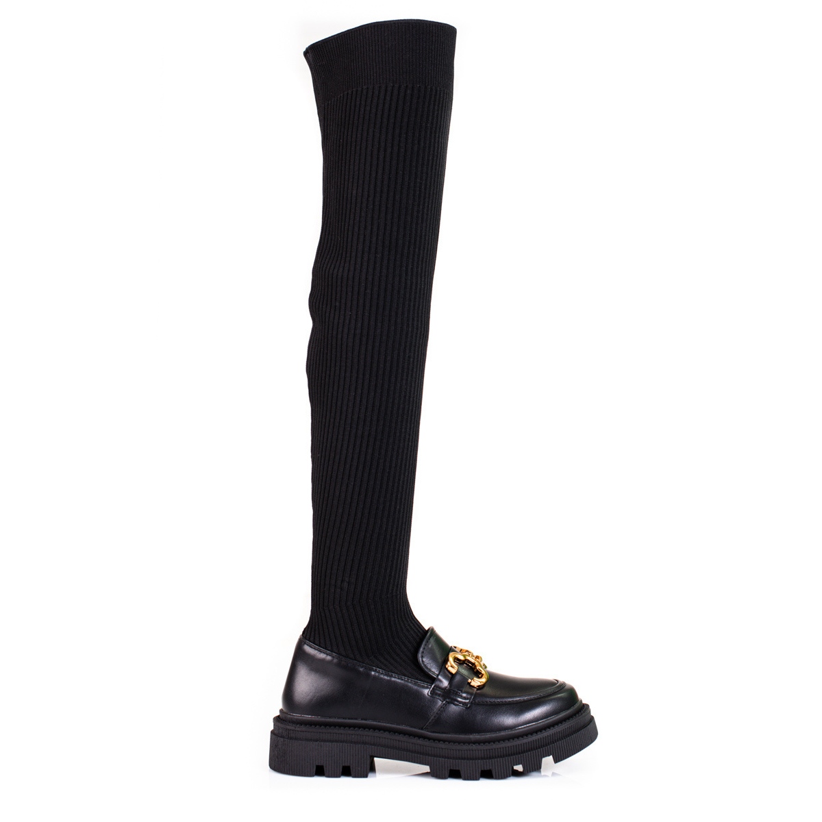 Cizme elegante, supra -Kidmal pentru femei din piele și țesătură ecologică de înaltă calitate (sus: 50% imitație a pielii, 50% textile). Un model cu o tăietură clasică, cu un nas rotund, plin și superior flexibil, care asigură potrivire și confort atunci când se poartă. Lanțul decorativ adaugă personaj și subliniază seara, natura la modă a pantofilor.