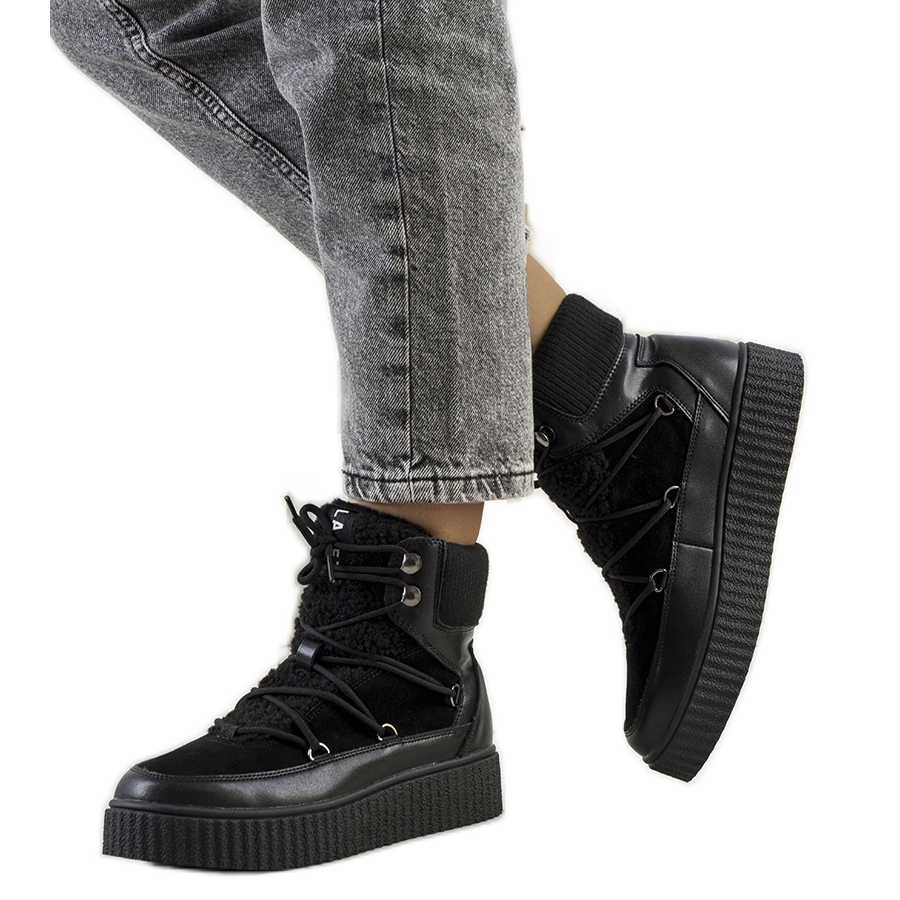 Interiorul pantofilor este finisat cu blană caldă, care protejează eficient împotriva frigului și, în același timp, adaugă un caracter confortabil. Închiderea cu dantelă permite o potrivire perfectă pe picior, ceea ce garantează confort la fiecare pas. Varful rotund si platforma inalta de 3,5 cm asigura stabilitate si confort, si alungesc optic picioarele.