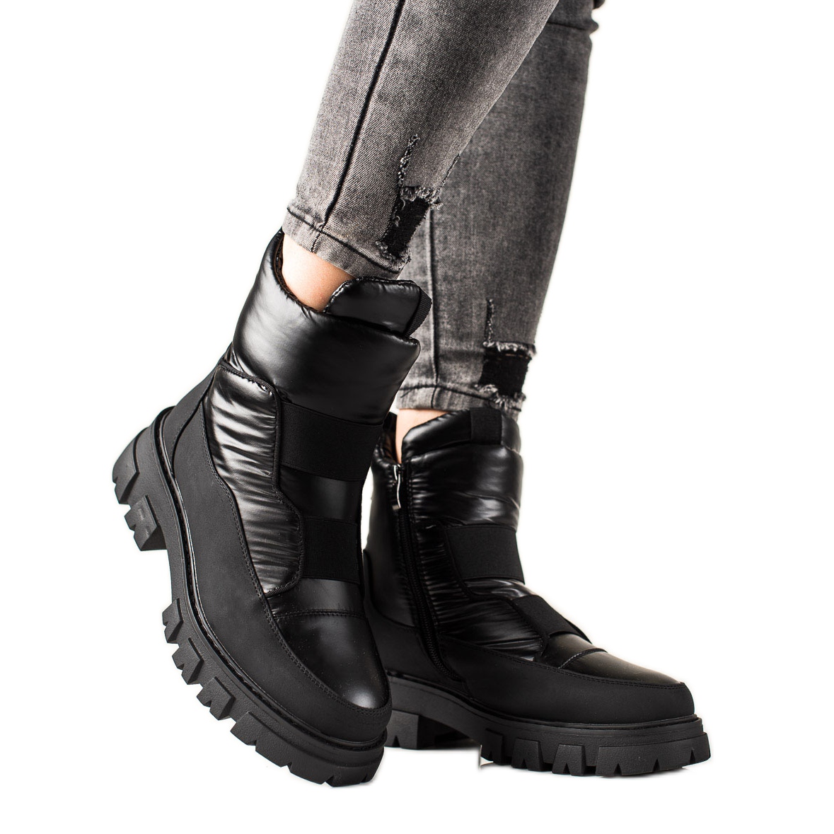 Cizmele de zapada au varf plin si toc rigid, inchis, care garanteaza stabilitate si sustinere pentru picioare. O talpă plată din plastic cu benzi de rulare asigură o bună aderență pe sol, ceea ce este deosebit de important în condiții de iarnă. Lățimea superioară de 18-20 cm și înălțimea de 14-15 cm fac ca pantofii să se potrivească bine piciorului.