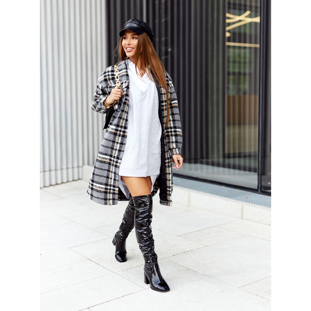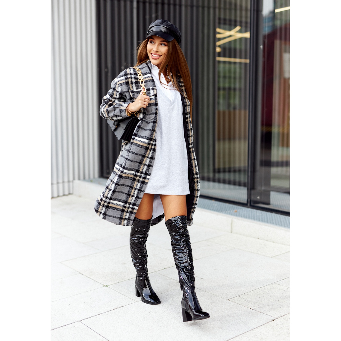 Partea superioară a lor înaltă, care ajunge la 57 cm, este îmbogățită cu un fermoar confortabil în partea inferioară, care îl face mai ușor de pus. Un vârf rotund și un toc lat de 8 cm înalt asigură stabilitate și confort de purtare pe tot parcursul zilei. Aceste cizme sunt echipate cu o pătură de pantofi, iar branțul izolator oferă căldură chiar și în zilele reci.
