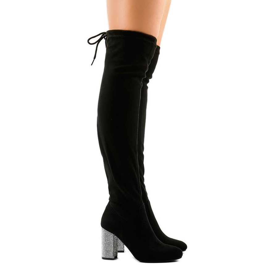Partea superioară înaltă, ajungând deasupra genunchiului, adaugă eleganță oricărui stil și face ca picioarele să pară mai subțiri. În plus, strasurile de pe călcâi adaugă un pic de strălucire, dând pantofilor un caracter original.