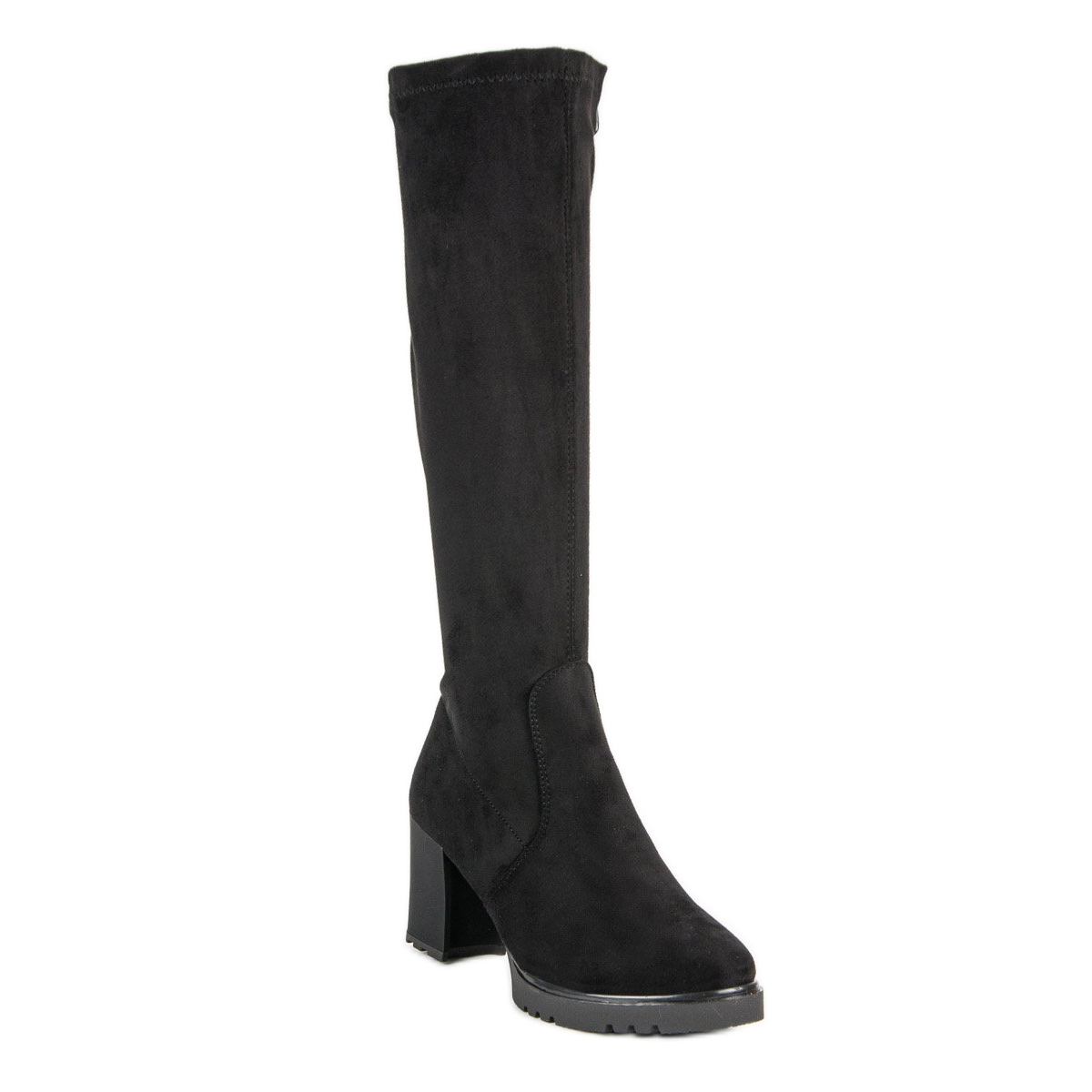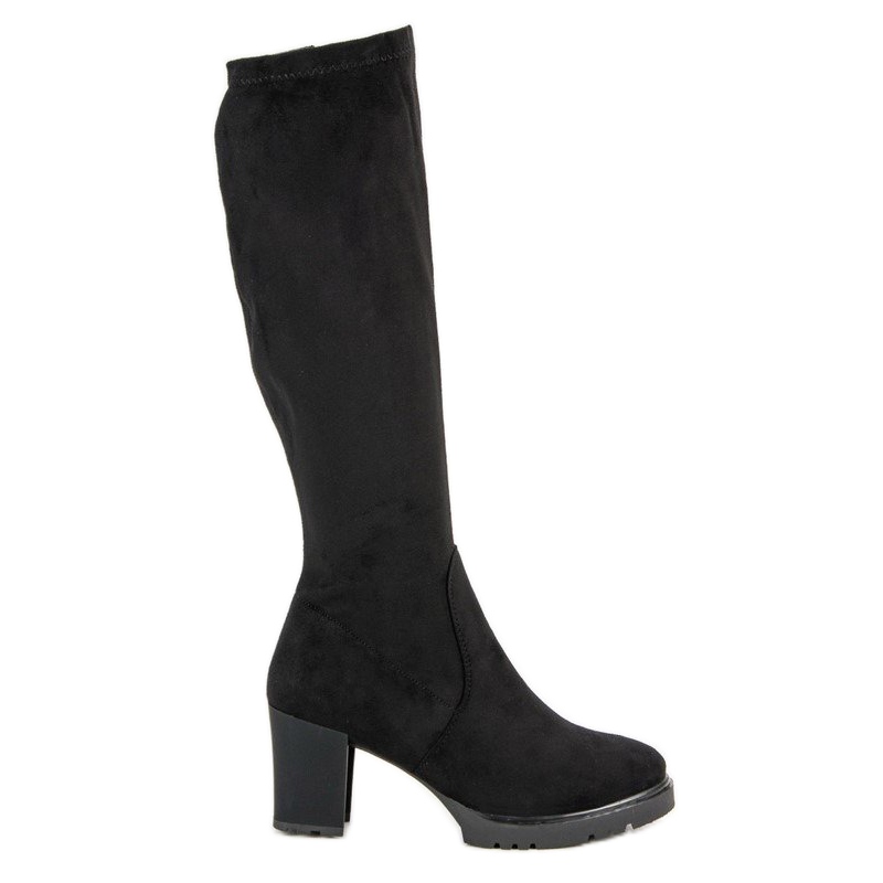 Cizmele negre din piele intoarsa sunt alegerea perfecta pentru femeile care doresc sa combine eleganta cu confortul. Realizate din piele intoarsa ecologica, arata extrem de stilat si se potrivesc celor mai noi tendinte de moda. Aceste cizme clasice până la genunchi subliniază perfect silueta feminină, iar tocul înalt de 8,5 cm face ca picioarele să pară mai subțiri și mai grațioase.