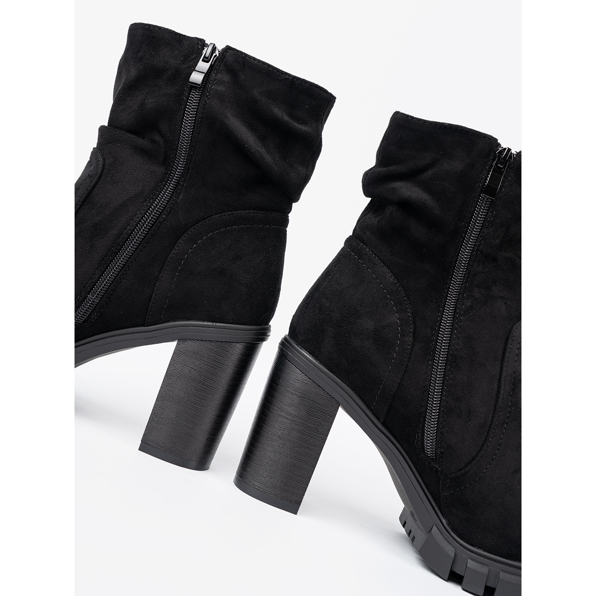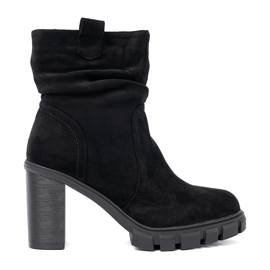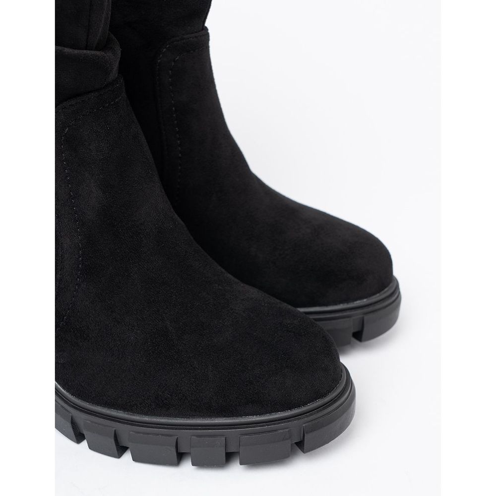Fabricat din imitație de înaltă calitate, Suede, cizmele arată extrem de atractive și luxoase. Culoarea lor neagră le face universale și le compun cu ușurință cu diverse stilizări. Superioara de 15 cm înălțime cu rufe le oferă caracter, iar călcâiul construit asigură stabilitatea și confortul purtat.