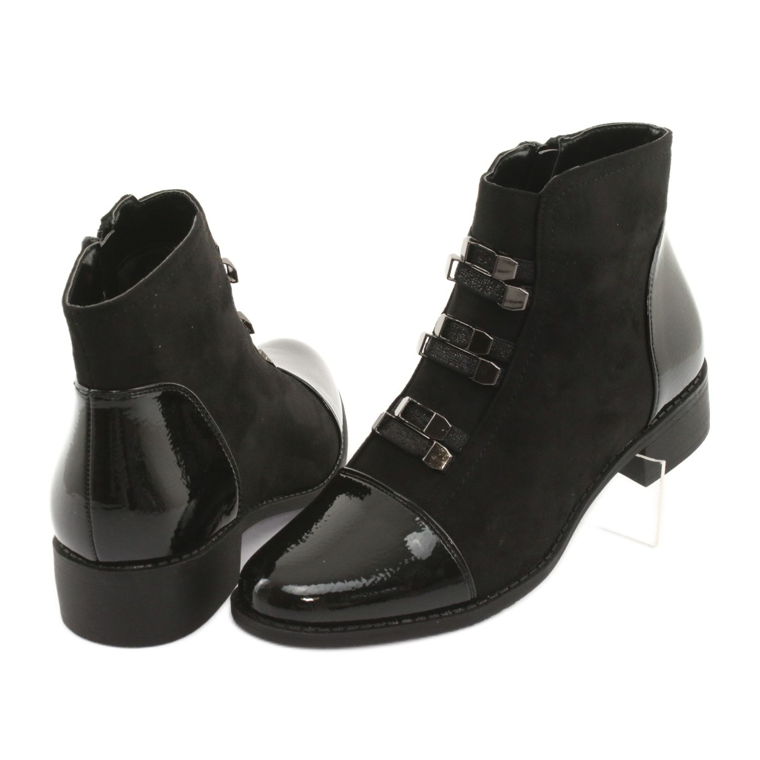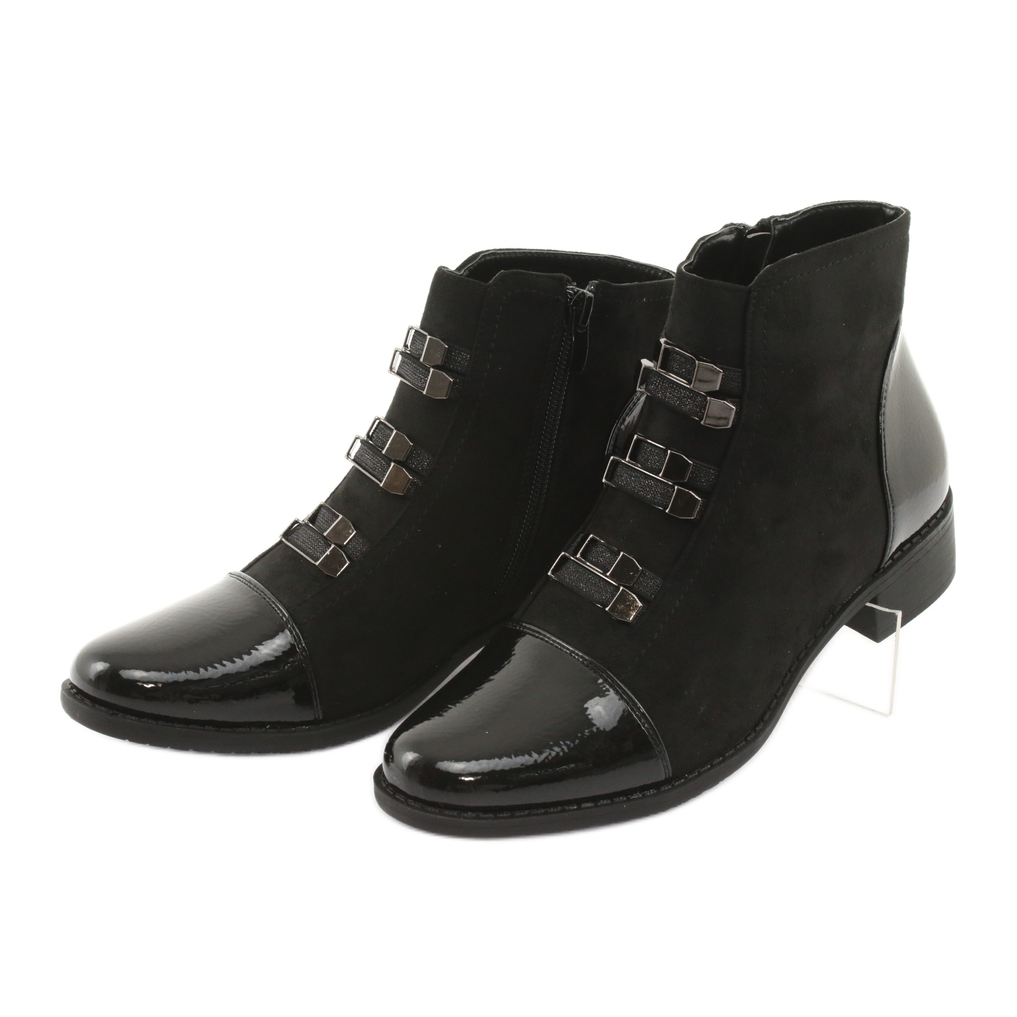 Cizmele se caracterizează printr-un toc plat și un decor original sub formă de catarame delicate în față, care le conferă un caracter modern. Modelul este căptușit cu blană neagră moale, asigurând confort și căldură chiar și în zilele mai reci. Indiferent de ocazie, sunt o alegere excelentă pentru orice anotimp.