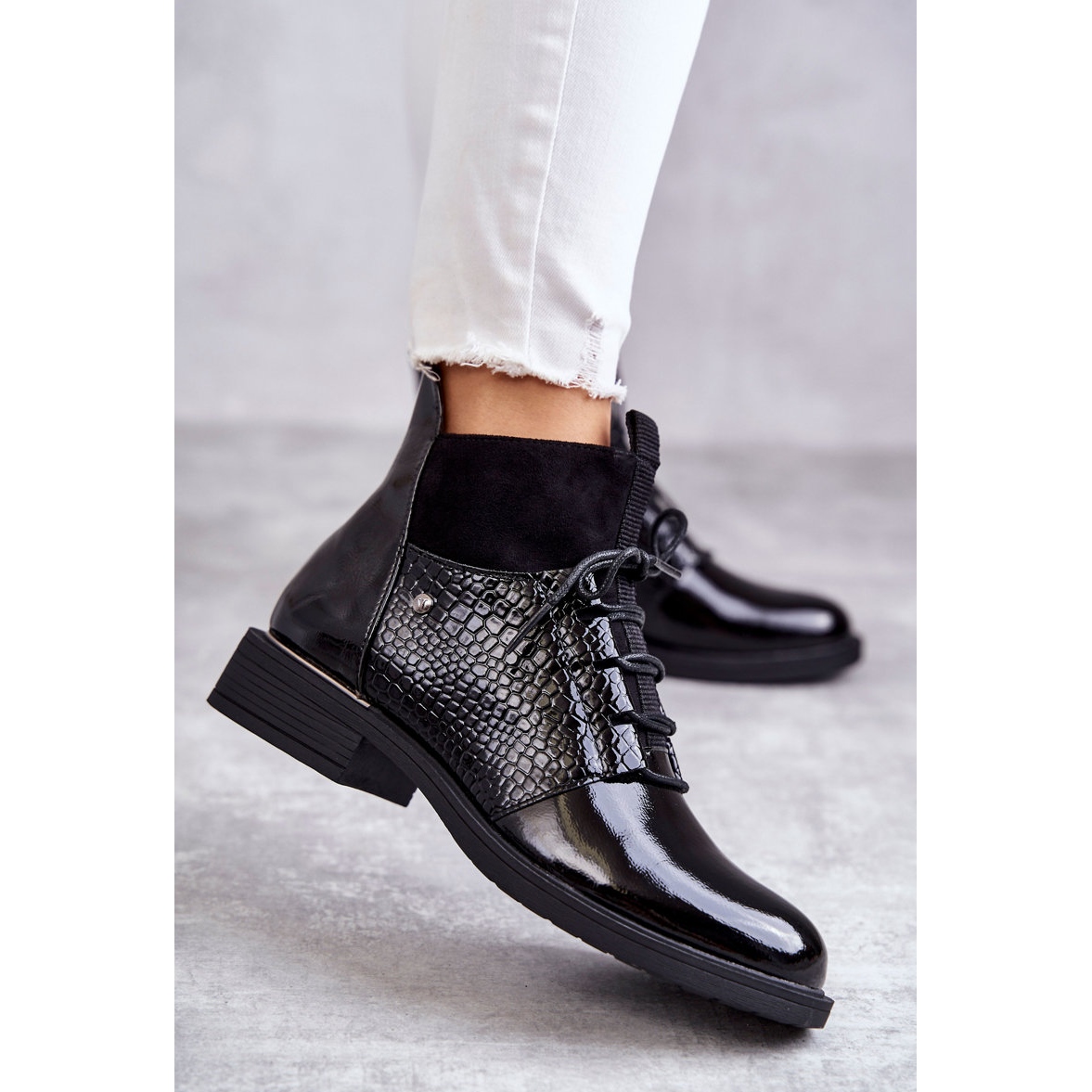Fabricate din piele ecologică de înaltă calitate, cu șarpe în relief, botinele Cathrine se remarcă printr-un finisaj strălucitor, atrăgător. Designul cu șireturi nu numai că arată grozav, dar permite și pantofului să se potrivească perfect piciorului. În plus, un toc plat, înalt de 3,5 centimetri, asigură confort la mers pe tot parcursul zilei.