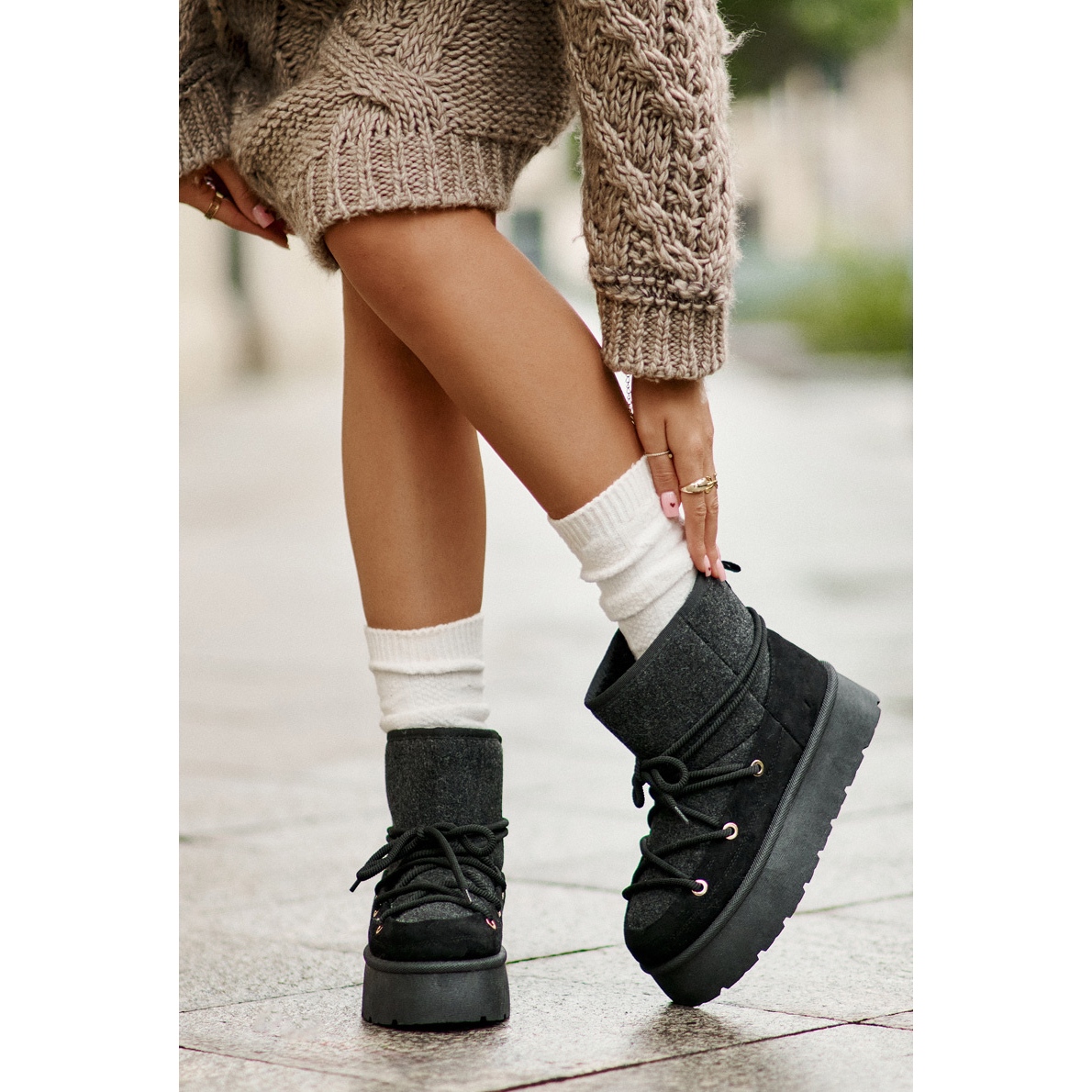 Cizmele de zăpadă cu șireturi pe platformă în negru sunt o alegere perfectă pentru fiecare femeie la modă care prețuiește atât stilul, cât și confortul. Acești pantofi unici combină designul modern cu caracterul practic, iar platforma lor înaltă de 5 cm asigură stabilitate la fiecare pas.